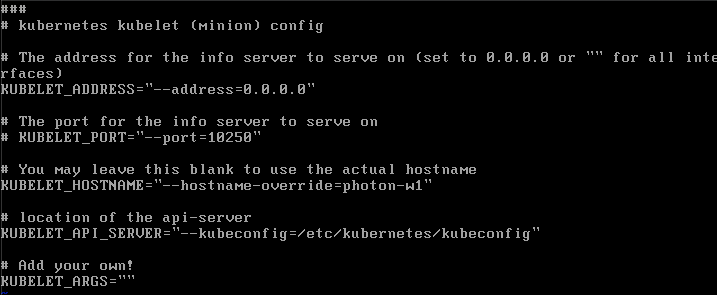 Lastly update /etc/kubernetes/config to define the master: KUBE_MASTER="--master=http://<your-hostname>:8080" where <your-hostname> matches your scenario, either what you configured in your DNS. Or if you don't have a custom DNS running you could update the host file on both machines to make it work.